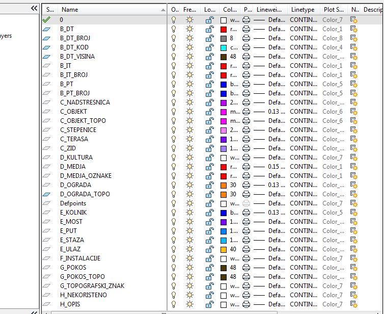 Geodet sam i koristim Autocad 10ak godina i promjenio sam nekoliko pristupa organizacije layera od onog pukog nazivanja layera; OGRADA, OBJEKT, KOLNIK..., pa do 2_OGRADA, 2_OBJEKT, 3_KOLNIK.