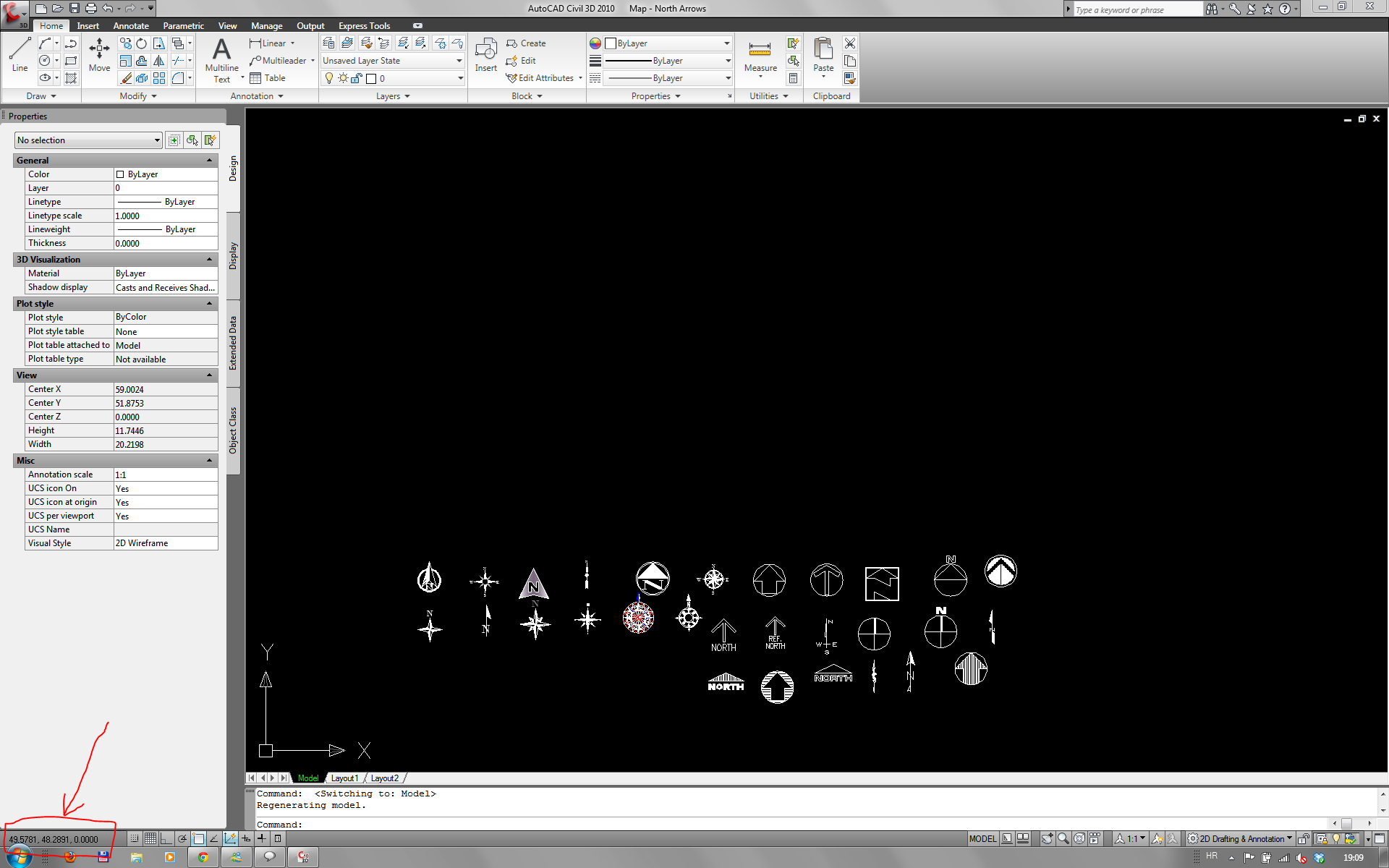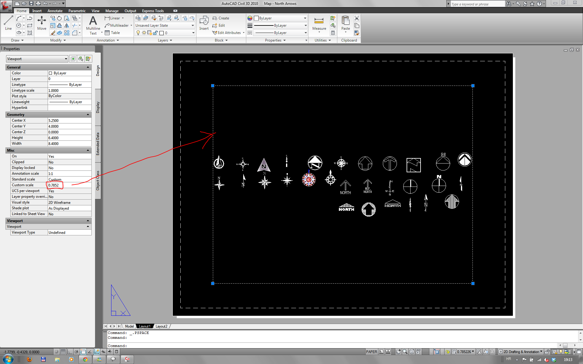 1. očitaj koordinatu neke točke u sredini tvog crteža u MODEL-u (slika 1)