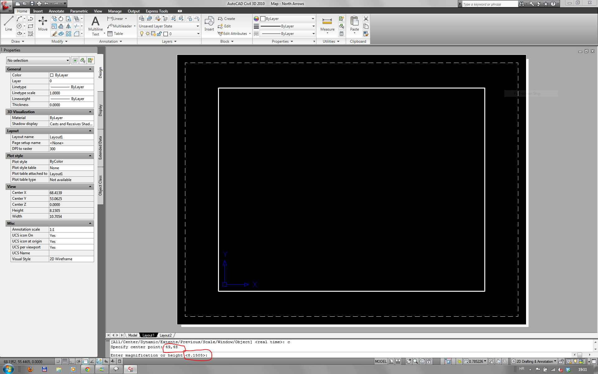 2. klikni na LAYOUT i uđi u model u LAYOUTU (dupli klik unutar VIEWPORTA. Napiši ZOOM i onda C (za Center) i unesi očitane koordinate i potvrdi s ENTER veličinu povećanja/visine (slika 2)